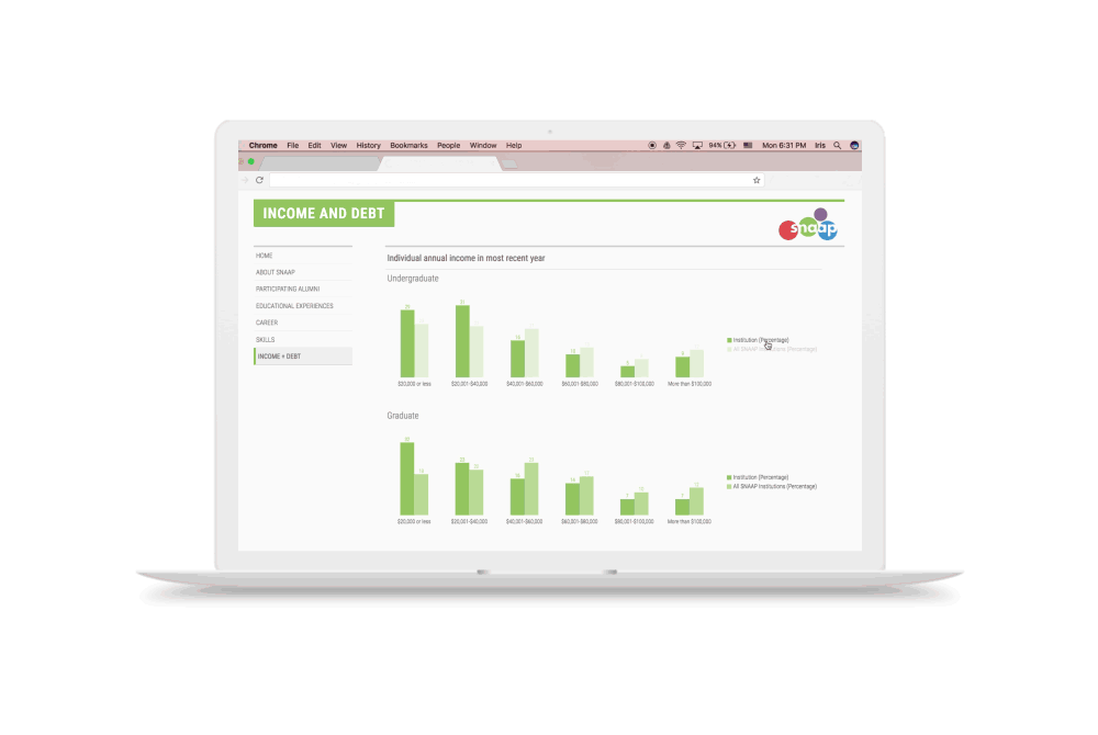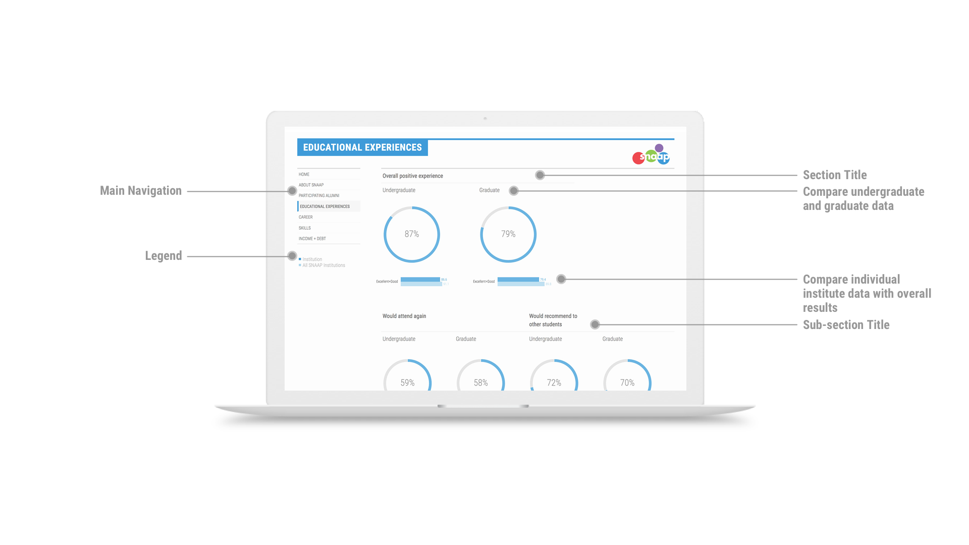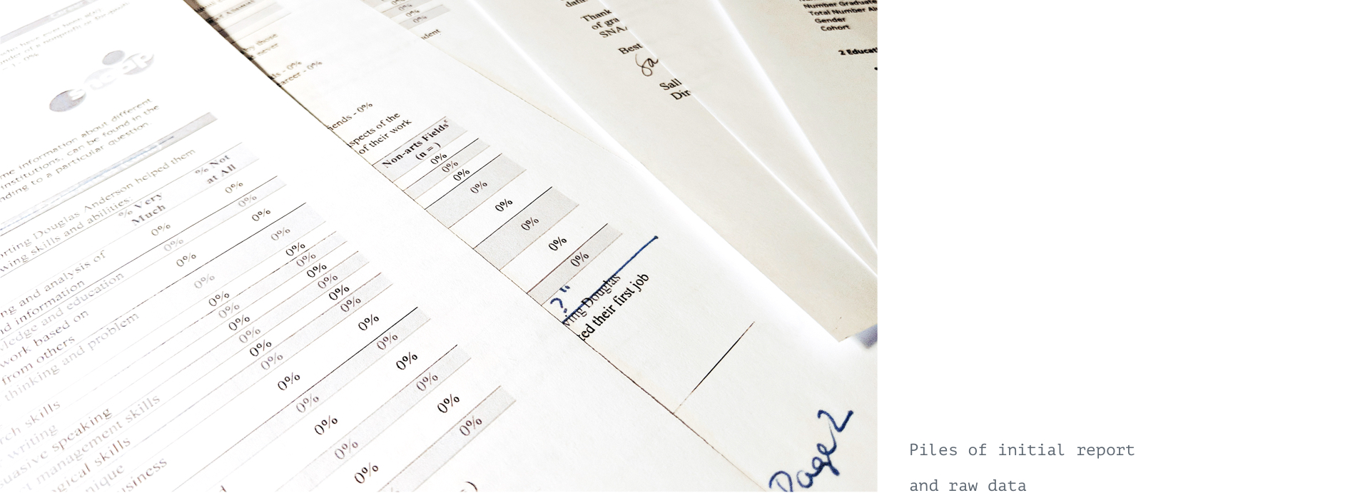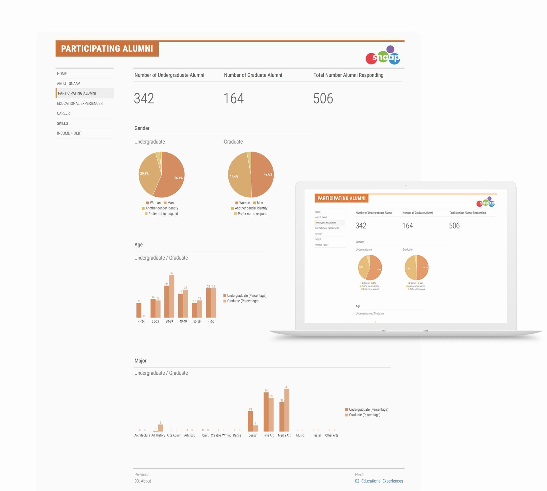 The challenge also comes from the massive raw data we received from the annual survey. Every year there are over 50 design and art institutes participated in SNAAP all over the nation and the survey results contains over 80 questions and 1250+ options. The final report for each institute has over 200 pages but all the information are presented without any visualization or storytelling. The solution has to make sense of these massive information and to provide each institute a good overview of the survey results.