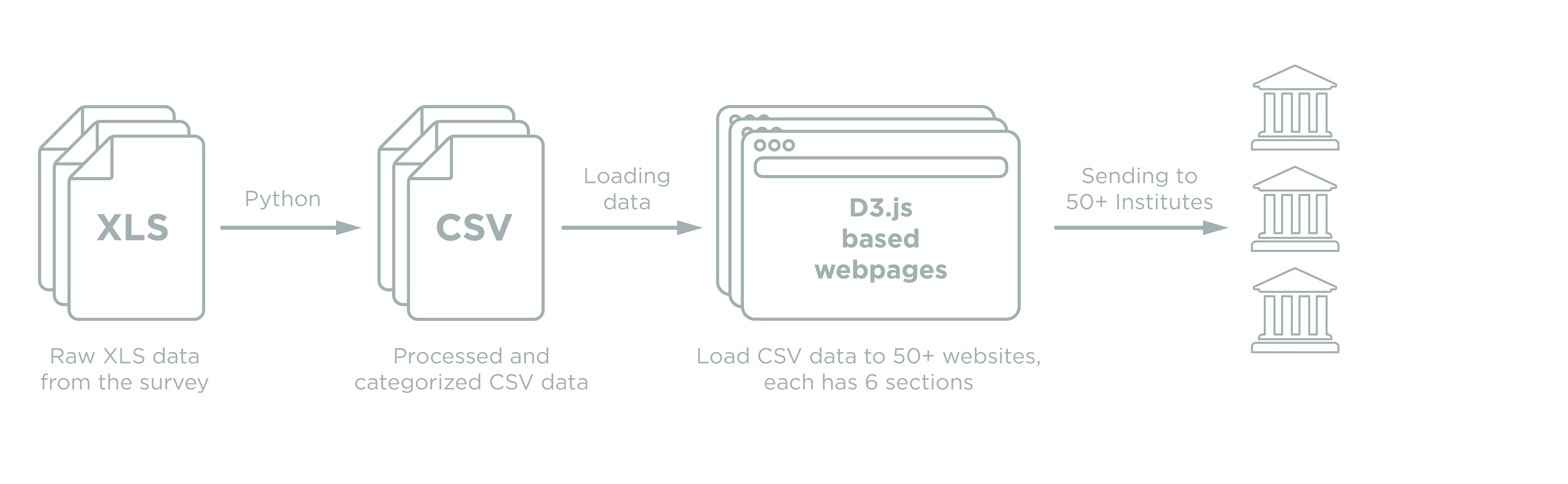 With understanding of both the data and the web design, I suggested below workflow to load the data dynamically since it is an annual survey and the same process will repeat every year. I then coded the website, also programmed the entire workflow using Python and D3.js. The efficiency has been hugely improved since its launch.
